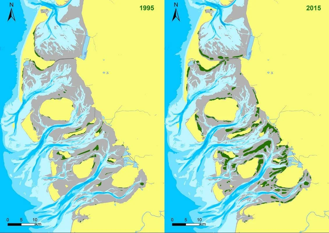 Deutliche Erholung: Im Jahr 2015 bedeckten Seegraswiesen eine viermal größere Fläche des Wattenmeeres als 20 Jahre zuvor. (Grafik: Tobias Dolch)